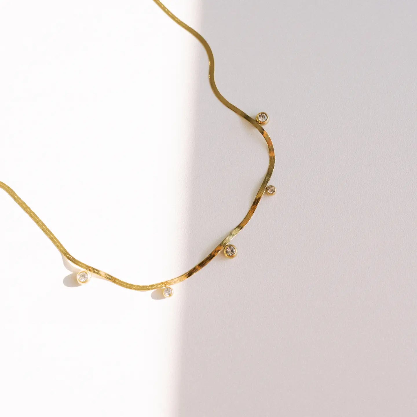 A timeless classic, our Cassi Herringbone Crystal Necklace will make you stand out! This luxurious 18k gold necklace sparkles with beautiful crystal pendants and is waterproof too, making it perfect for layering and everyday wear. Add a touch of sophistication to your style! * Length: 15.5" + 2" extender chain * Waterproof * Tarnish resistant * 18K Gold plated stainless steel * Hypoallergenic