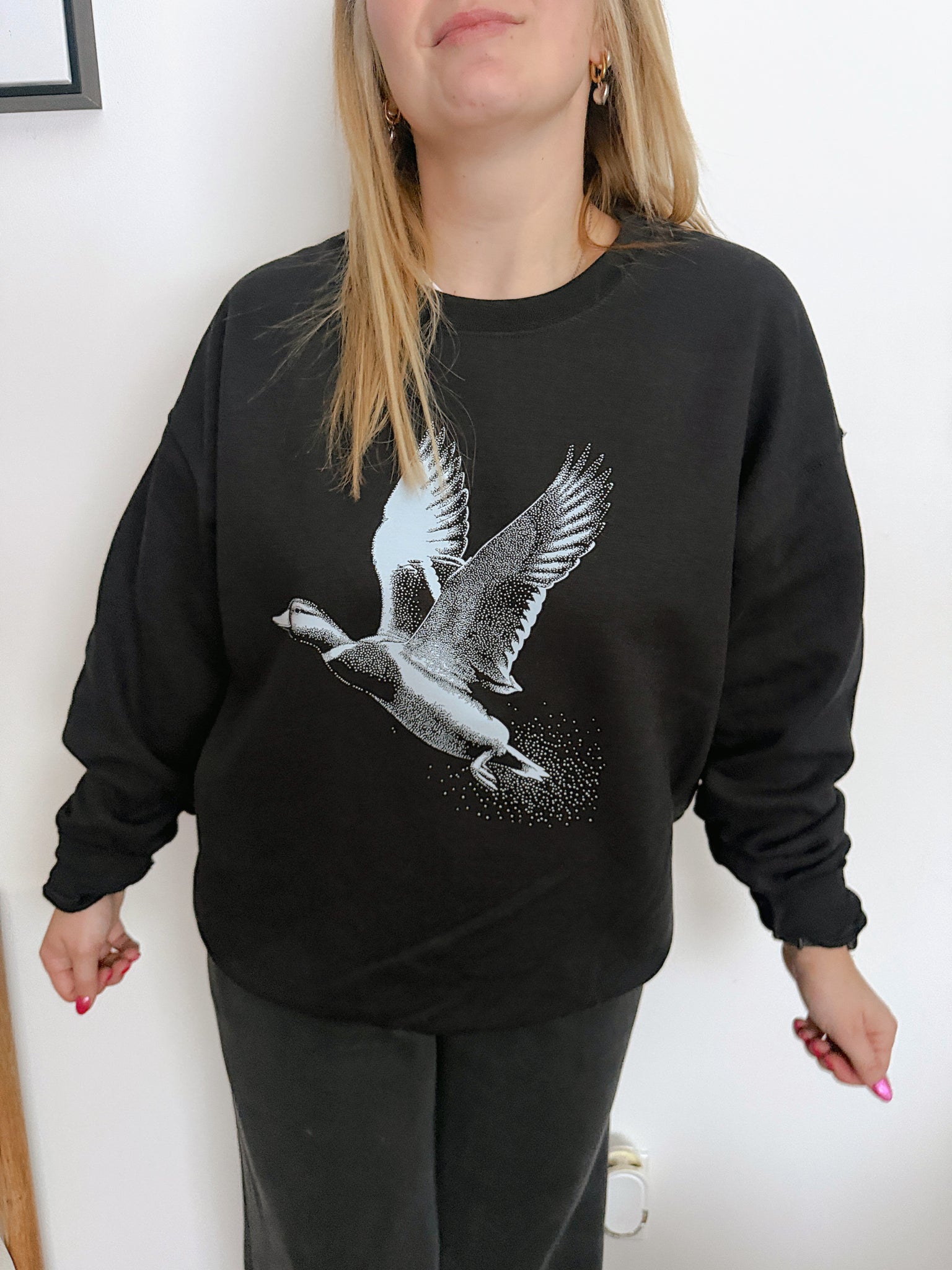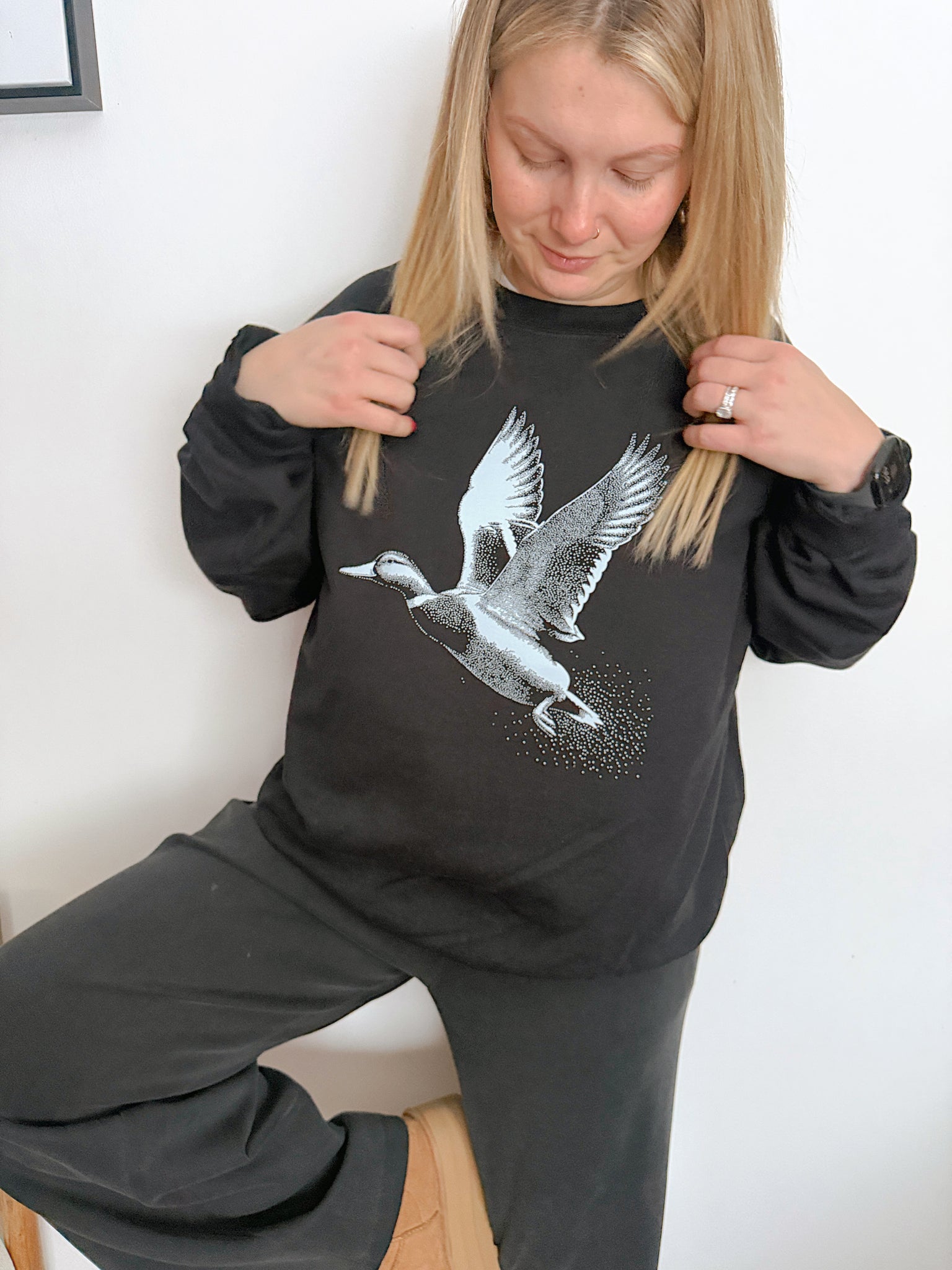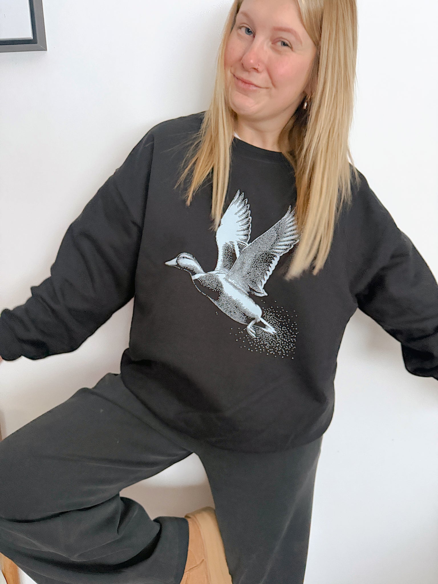 Mallard Halftone, by Walking A provides a unisex fit on a black tee crew, or hoodie.