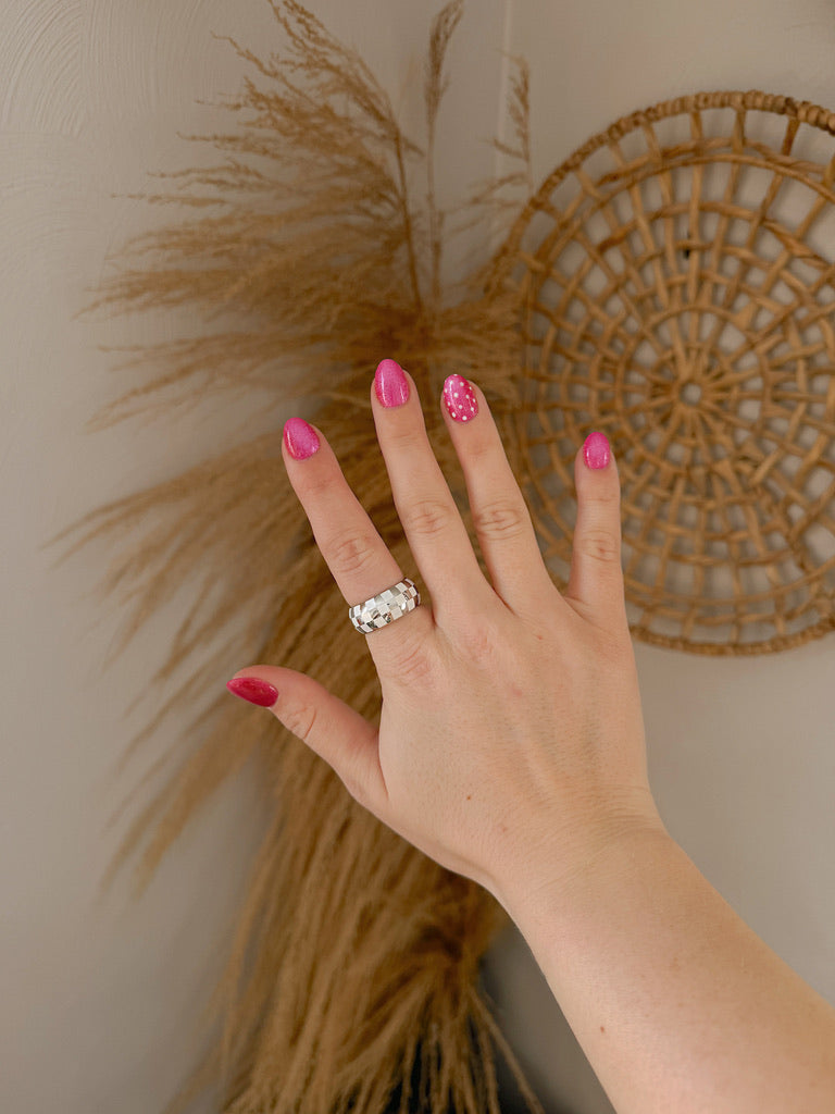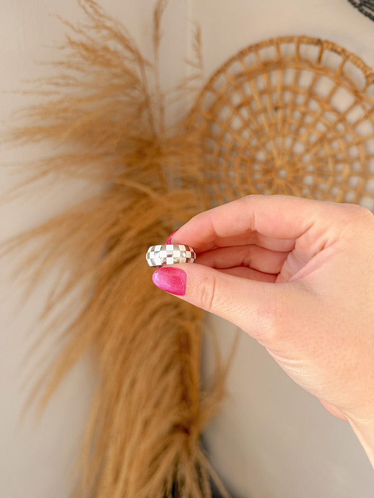 Show off your style with this Ronnie Checkered Ring — a beautiful gold and white or silver and white checkered design, perfect for any occasion. Add a touch of class to your look and make a statement with this stunning piece of jewelry. Make an unforgettable impression today! • Waterproof • Tarnish resistant • 18K Gold plated stainless steel • Hypoallergenic